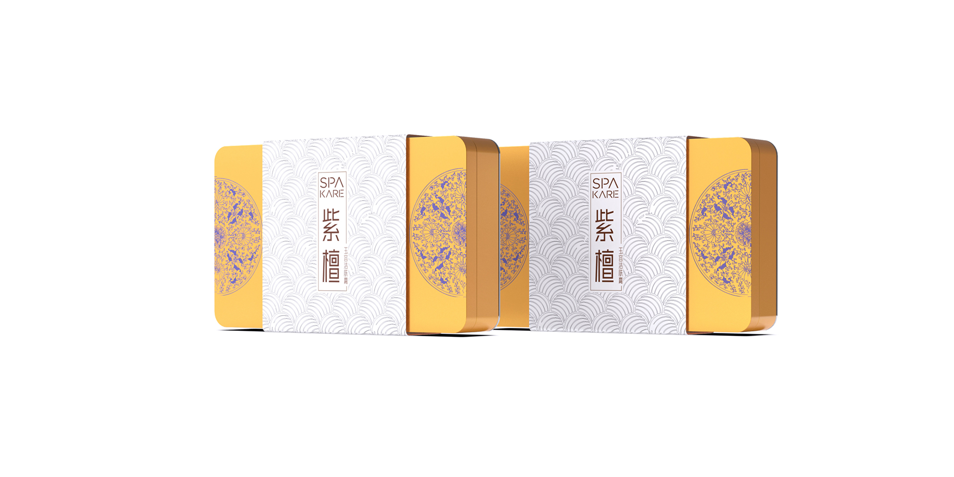 盒體布局靈感來源古代龍袍兩肩處圓形紋樣,圓形象征圓滿完美。盒體與盒體相接兩側紫檀花紋樣會組成完滿的圓形。紫金配色透露著品牌低調與奢華,白銀的傳統(tǒng)水紋腰封強化品牌調性。