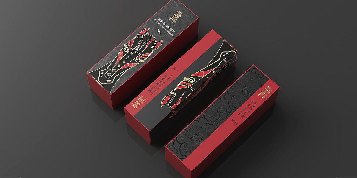 本方案增加兩種不同面霜瓶與包裝設(shè)計。左邊采用硬卡天地蓋形式,瓶身采用紅黑漸變,連接黑色瓶蓋,瓶蓋采用寶相花紋刻印,增加細節(jié)與層次感。天地蓋硬卡盒版設(shè)計增加馬頭燙金墊板,呼應(yīng)品牌“馬油”印象。采用漆器紅黑配色,打造漢唐視覺效果,體現(xiàn)低調(diào)奢華的貴族氣質(zhì)。