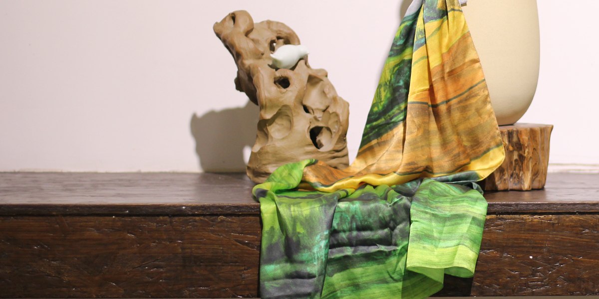 丁偉先生創(chuàng)作的《地平線》蘊(yùn)含豐富的自然景色,依次為設(shè)計(jì)元素,將自然土地的顏色與草地的顏色融合,呈現(xiàn)自然地混合色,同時(shí)結(jié)合絲巾材質(zhì),整體都有自然的飄逸之感。