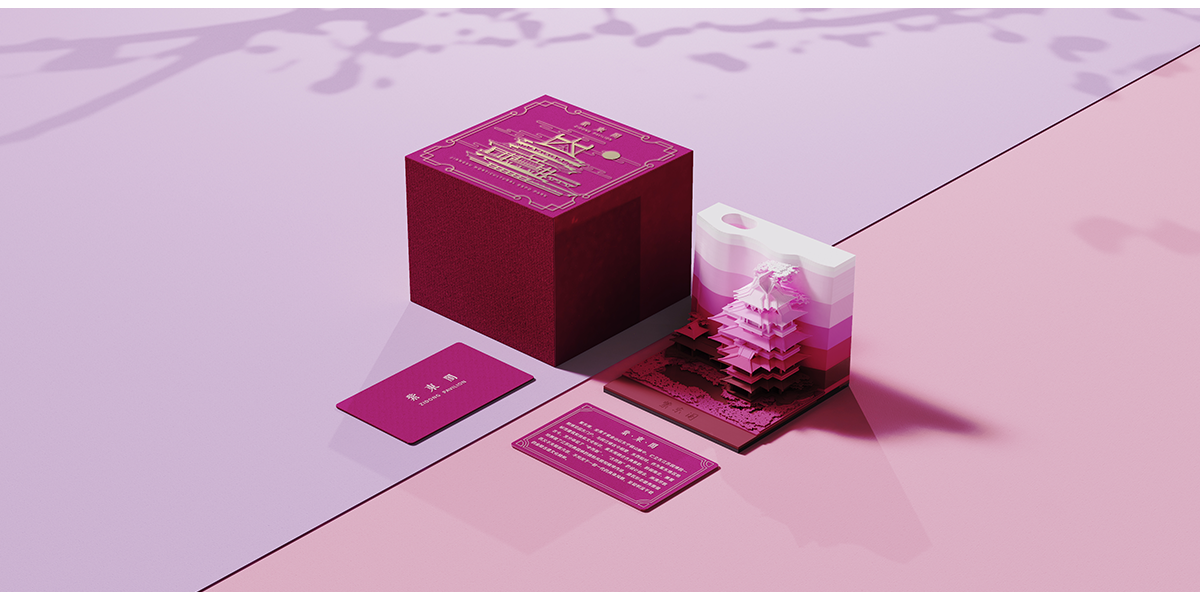 紫東閣融合古典意蘊,韻調(diào)南北、兼蓄古今,充分體現(xiàn)了“中而新”、“古而新”的設計理念。此次便利貼設計以紫東閣建筑為設計著眼點,將便簽紙與立體紙雕相結合,以紫色漸變?yōu)橹黧w配色,營造出較強烈的視覺氛圍。同時,凸顯紫東閣的歷史厚重,文化積淀。
