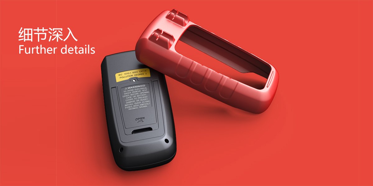 C.A. 萬用表是一款面向歐洲和美國的中低端市場的便攜式檢測設(shè)備。西方用戶群體手掌普遍較大,且使用該產(chǎn)品需佩戴絕緣手套,因而產(chǎn)品的按鍵和旋鈕撥盤做出了適當(dāng)?shù)臄U大化處理。旋鈕撥盤為嵌入式設(shè)計,確保將表翻轉(zhuǎn)朝下水平放置在桌面上時,旋鈕臺面不接觸,有效減少磨損