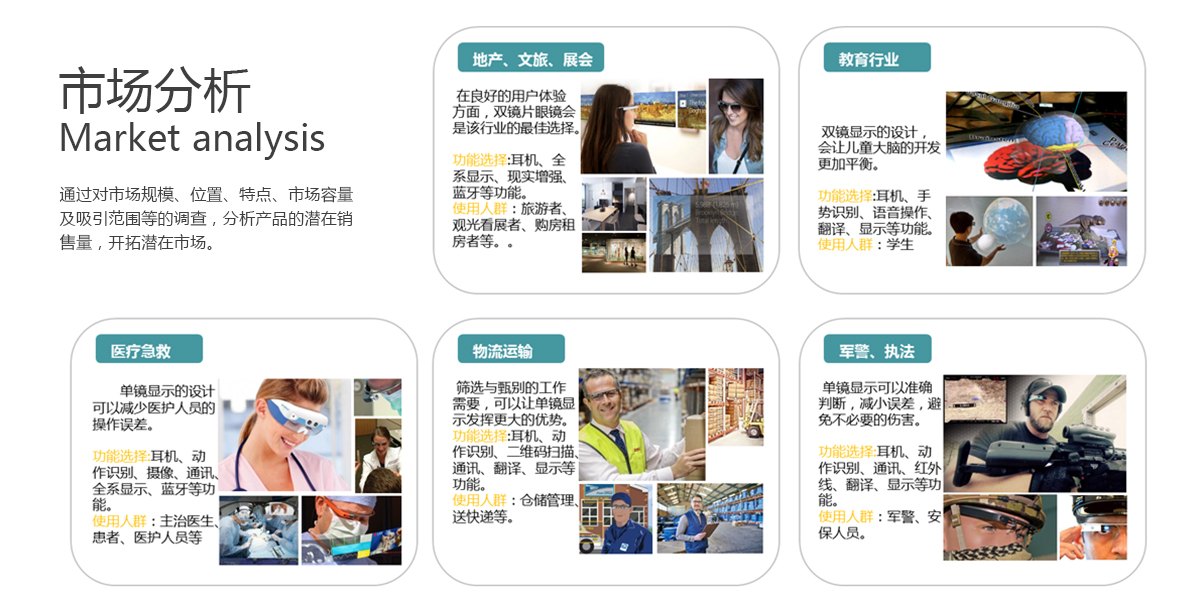 其作為智能眼鏡行業(yè)運用的標桿性產(chǎn)品,顛覆了以往智能眼鏡給人的觀感,全新定義了產(chǎn)品的原型。產(chǎn)品全部選用環(huán)保材質,外觀件特別選用符合醫(yī)用標準的親膚性材質。整體式環(huán)形設計在視覺上會給人一種穩(wěn)定而安全的感覺,符合產(chǎn)品應用行業(yè)的形象特征。