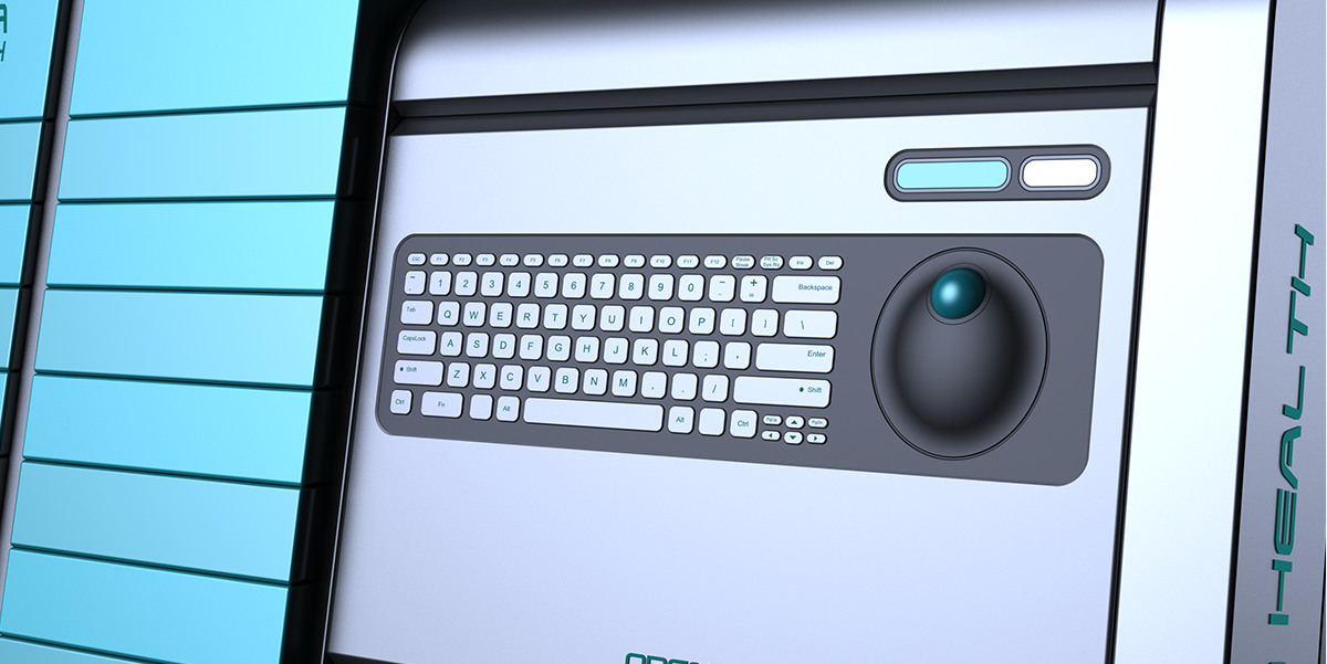 產(chǎn)品設(shè)計(jì)風(fēng)格簡約、現(xiàn)代,通過幾何形體的穿插,劃分出儲藏區(qū)域和控制區(qū)域。右側(cè)的控制區(qū)域鍵盤臺面可以翻開,形成一個(gè)可以供醫(yī)生寫字的臺板,既人性化又不影響產(chǎn)品造型的整體美感。