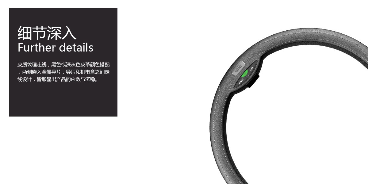 為龍泉千成設計的心電監(jiān)測方向盤皮套,設計前期進行了大量的產(chǎn)品調(diào)研,在充分考慮功能性需求、養(yǎng)護、安全標準、技術(shù)復雜性的前提下,堅持項目創(chuàng)新性的設計原則。