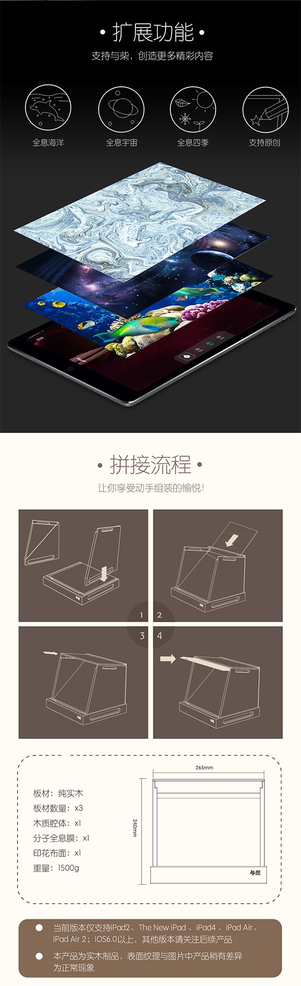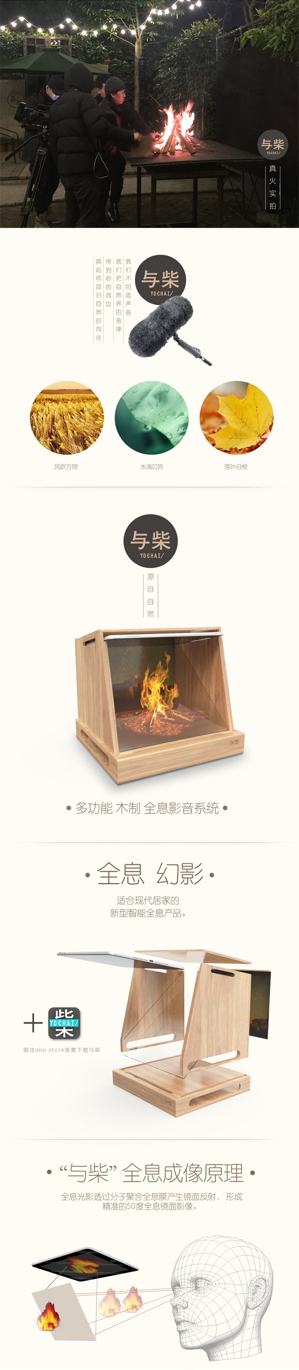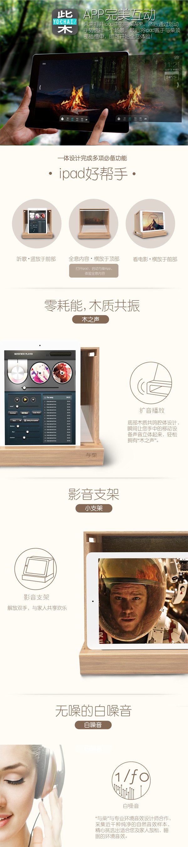 純木質(zhì)手作的多功能全息影音系統(tǒng),與ipad結(jié)合使用、拓展ipad更多功能。全息智能產(chǎn)品取名“與柴”, 寓意“與柴桑樵牧“,以科技傳承匠心精神。