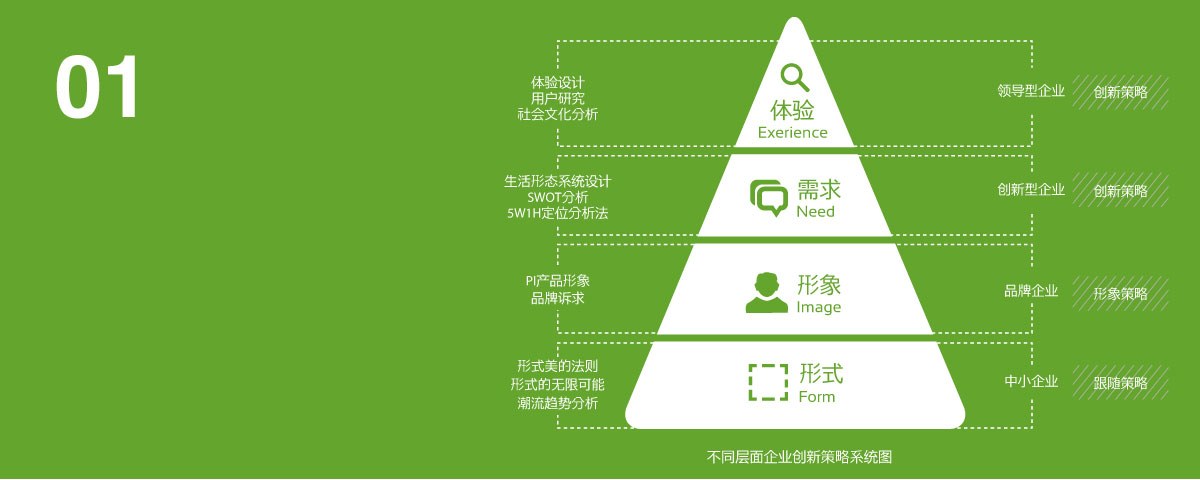 中國的制造企業(yè)現(xiàn)狀是多層次的,既有外向型加工型企業(yè),又有品牌企業(yè)和高科技企業(yè),工業(yè)設(shè)計要為多層次的產(chǎn)業(yè)服務(wù),需要構(gòu)建多層次的服務(wù)系統(tǒng),以滿足多樣化的創(chuàng)新需求。 不同發(fā)展階段的企業(yè)對于工業(yè)設(shè)計的認(rèn)識和需求是不一的。對于技術(shù)導(dǎo)向型企業(yè)而言,設(shè)計僅僅是體現(xiàn)產(chǎn)品技術(shù)的手段;對于需求導(dǎo)向型企業(yè)而言,設(shè)計需要挖掘市場和用戶的 潛在需要。創(chuàng)新型企業(yè)和跟隨策略型企業(yè)在市場競爭面前也會選擇不同的設(shè)計方法。通過對企業(yè)需求類型進分類,并找到相應(yīng)的設(shè)計方法,可以解決企業(yè)設(shè)計有效創(chuàng)新的問題。 “形式”、“形象”、“需求”、“體驗”是設(shè)計由淺入深的四個階段,不同層面的企業(yè)會對應(yīng)不同的重點。