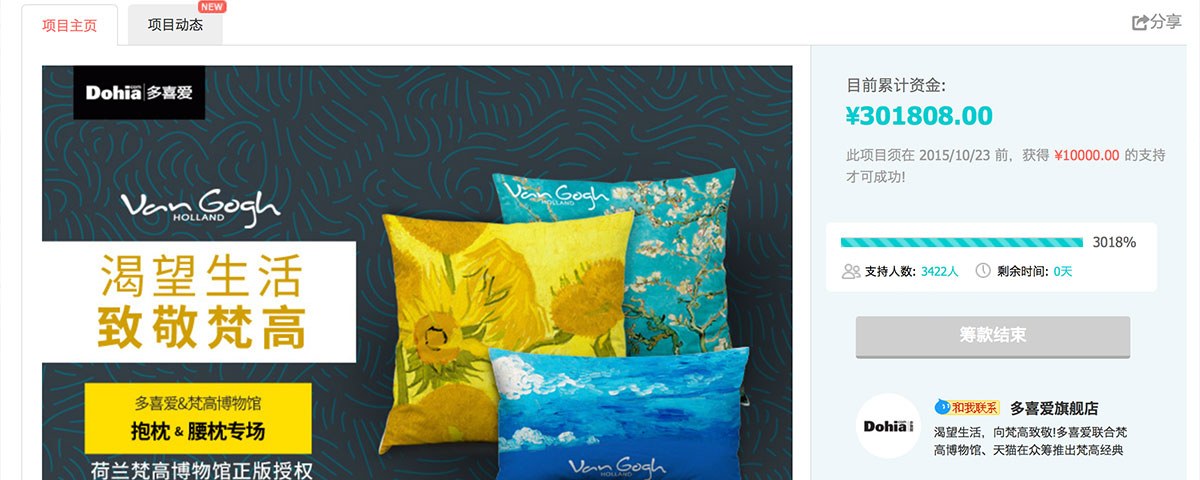 木馬設(shè)計(jì)聯(lián)合天貓眾籌平臺(tái),與天貓數(shù)十家商家合作,以梵高博物館正版授權(quán)的梵高八大作品為藍(lán)本,創(chuàng)作正版限量系列藝術(shù)衍生品,作品包括枕墊、杯具、鼠標(biāo)、窗簾、手包等一系列家居飾品。產(chǎn)品一經(jīng)推出便受到消費(fèi)者熱烈歡迎。此次合作是設(shè)計(jì)機(jī)構(gòu)涉足藝術(shù)衍生品領(lǐng)域的一次突破性的成功嘗試,由多方的協(xié)同合作創(chuàng)建了優(yōu)秀健康的商業(yè)模式,保證了閉環(huán)的、順暢的資源流通,為藝術(shù)衍生品市場(chǎng)提供了優(yōu)秀商業(yè)案例。