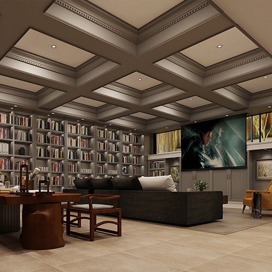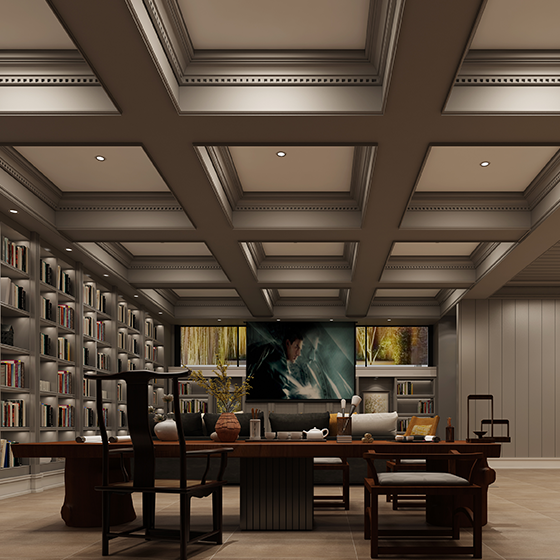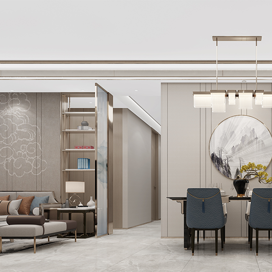 本案設(shè)計以新中式為主要風(fēng)格,在書房、客廳大量采用格柵設(shè)計,在餐廳上設(shè)計圓形裝飾畫,寓意天圓地方,在書房背面還設(shè)計了一整面博古架,傳承了中式古典設(shè)計理念,在整體顏色上淺色地磚加原木色的墻面裝飾,視覺效果極為舒適,營造出的空間效果極具高級感。