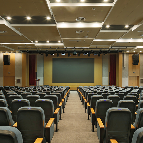 學術報告廳以實用、莊重、大氣為主要設計理念,并根據原有建筑機構采用階梯式設計方案,在頂面裝飾預留出足夠高度,并通過筒燈的分布人為將頂部分為若干部分實現(xiàn)區(qū)域局部照明,并充分考慮采光、隔音等訴求,在功能上滿足學術報告、表彰會議、多媒體教學等多方面需求。