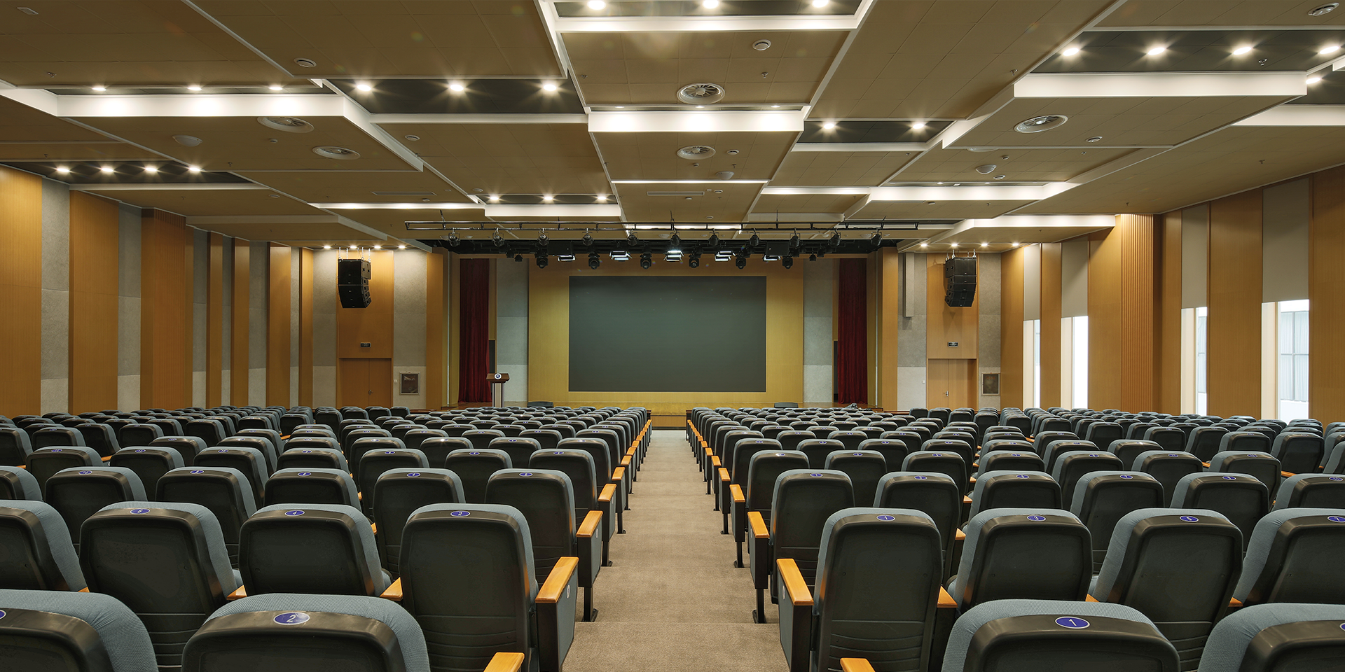 學(xué)術(shù)報告廳以實用、莊重、大氣為主要設(shè)計理念,并根據(jù)原有建筑機構(gòu)采用階梯式設(shè)計方案,在頂面裝飾預(yù)留出足夠高度,并通過筒燈的分布人為將頂部分為若干部分實現(xiàn)區(qū)域局部照明,并充分考慮采光、隔音等訴求,在功能上滿足學(xué)術(shù)報告、表彰會議、多媒體教學(xué)等多方面需求。