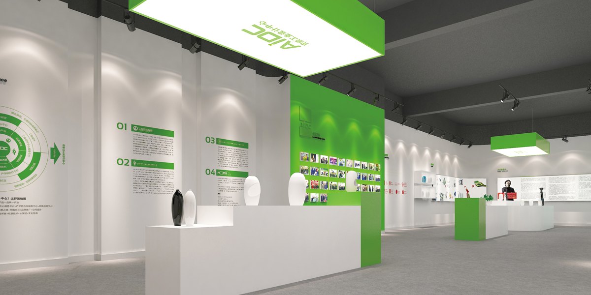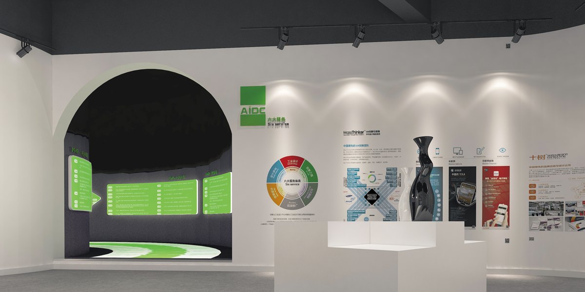 展廳功能區(qū)劃分為人工智能、智慧城市、生活美學(xué)、文創(chuàng)IP、醫(yī)療健康、裝備制造六大產(chǎn)業(yè)設(shè)計核心板塊,以品牌主色色塊分割串聯(lián)整個展示空間,使動線及路徑更加生動明晰。