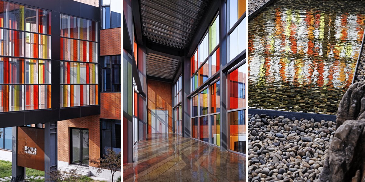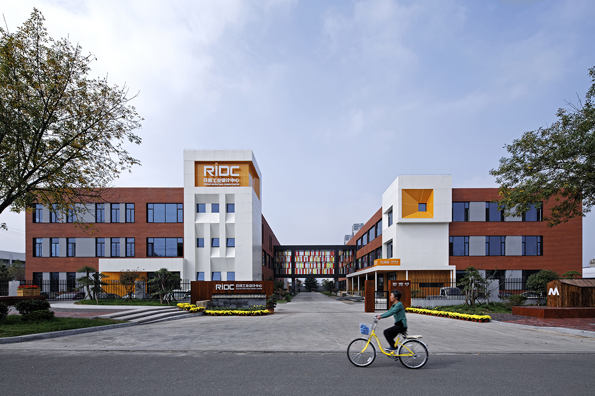 園區(qū)整體設(shè)計語言采用整體紅色為主的外立面,在白色造型和局部少量桔色塊、黑色窗套鋼構(gòu)等線條的搭配下充滿了熱情和明媚,化解了方形直線條為主的剛硬與冷漠。通過對原有舊廠房進行改造及重構(gòu),構(gòu)建以工業(yè)設(shè)計為核心的創(chuàng)新平臺。