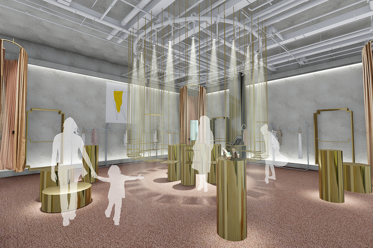 整個(gè)空間內(nèi)以“劇場(chǎng)”為主線,將戲劇分為開端、進(jìn)展、高潮、結(jié)局四個(gè)部分,分別對(duì)應(yīng)串聯(lián)入口區(qū)、中島售賣區(qū)、互動(dòng)區(qū)、收銀區(qū),巧妙呈現(xiàn)空間動(dòng)線。在空間的營造中,運(yùn)用了多種材料來傳達(dá)空間的豐富體驗(yàn)。