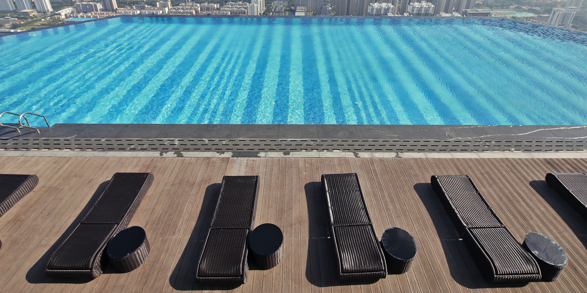 本案坐落于日照最高樓安泰國際廣場樓頂,通過對游泳池邊緣的特殊設(shè)計,讓游泳池可以達(dá)到看似沒有邊的視覺效果,從而人們可以感到在空間上無限的視覺體驗,建筑與自然完美結(jié)合,目光所及,碧藍(lán)的池水與遠(yuǎn)處的藍(lán)天碧海融為一體,視覺效果十分驚艷。